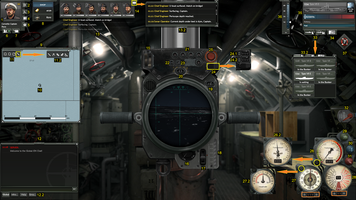 14- Nesta janela encontras os 6 Oficiais a bordo do submarino. Estes são, 1WO-Oficial de Armas(Weapons Officer), 2WO-Oficial de Observação(Watch Officer), CE-Engenheiro Chefe(Chief Engineer), Navegador(Navigator), Operador de Sonar(Sonar Operator) e Operador de Radio(Radio Operator). Poderás interagir com eles e utilizar diversas habilidades. Mais informação a ser adicionada de futuro.