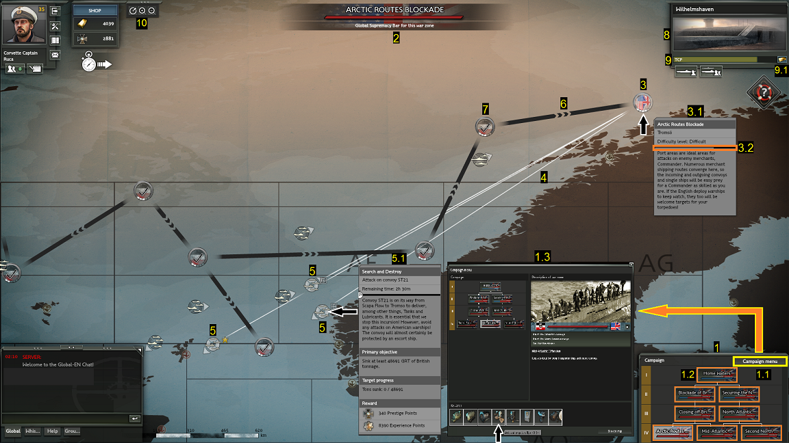 Durante o decorrer do tutorial é explicado como navegar traçando rumos, calculando soluções de disparo de torpedos, como usar o mapa e mais controlos.