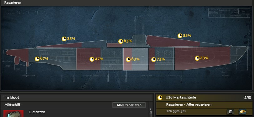 Dann kam die Meldung die wir alle nicht hören wollen „Wassereinbruch außer Kontrolle“. Das Boot fiel in gemeldete kritische Tiefen während der Druckkörper gereppt wurde. Im Rückwärtsgang, Ruder hart eingeschlagen und voller Fahrt war es möglich das Boot (7C mit Level 5 Druckkörper) auf 278m zu stabilisieren, dann war es nur noch halbvoll und fing wieder an zu steigen. Oben ging die Jagd dann weiter – Flak und DG außer Betrieb, mit einem einzigen funktionsfähigen Torpedorohr waren meine Optionen begrenzt. Aber ich wurde auch nur noch von einer angeschossenen Zerre aktiv gejagt, für die reichte es noch. Sobald diese ausgeschaltet war versetzte mir noch ein Flieger einen WABO Treffer. Rauf ging nicht, da Flak beschädigt und zwei lahme Zerren in Reichweite waren, also wieder runter. Jetzt wurde es sehr kritisch. Als „wird angegriffen“ endlich durch „Feindkontakt“ ersetzt wurde war auf der Nase von dem Boot noch ein klitzekleiner weißer Fleck zu sehen. Der Rest war rot. Mit diesem roten Boot, allen Offizieren und 17 Mann an Bord gelang der Sprung in den sicheren Bunker.